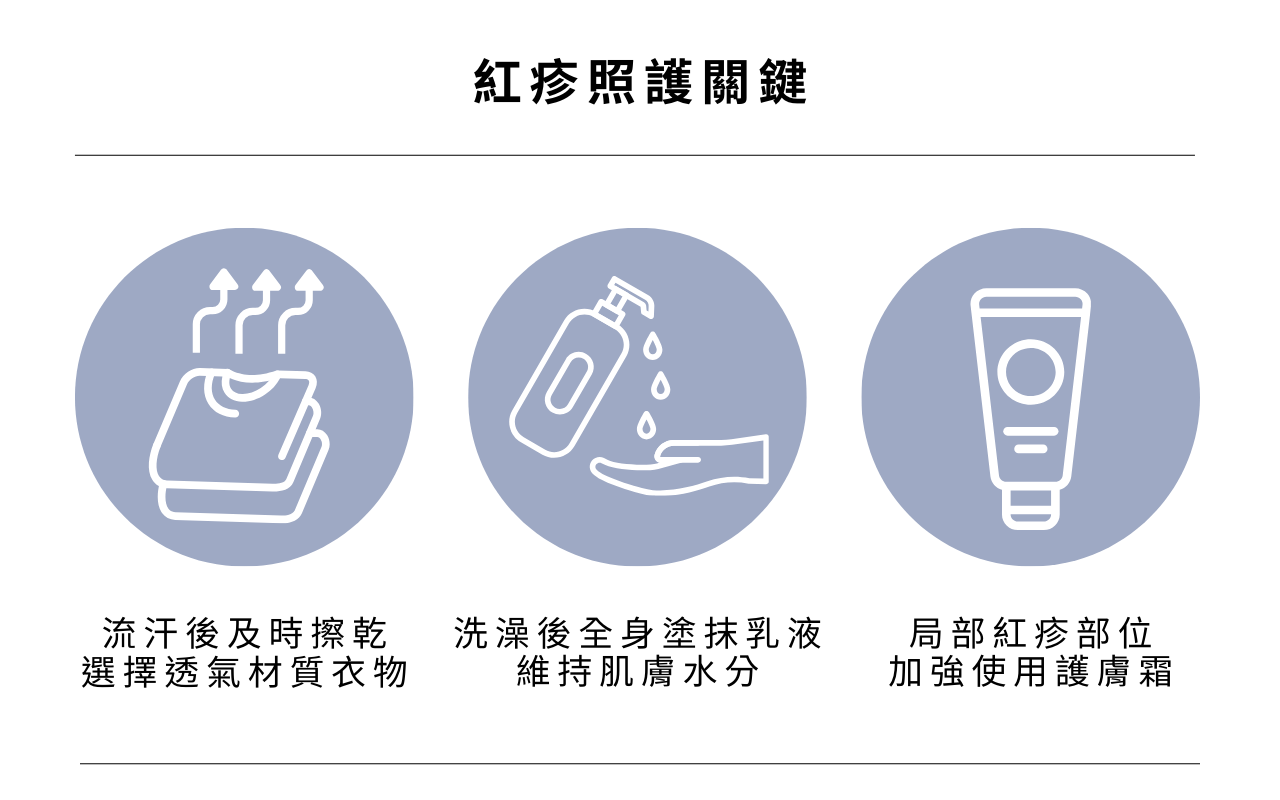 照護提醒:保持肌膚乾爽通風,選擇透氣衣物並避免過度包裹。