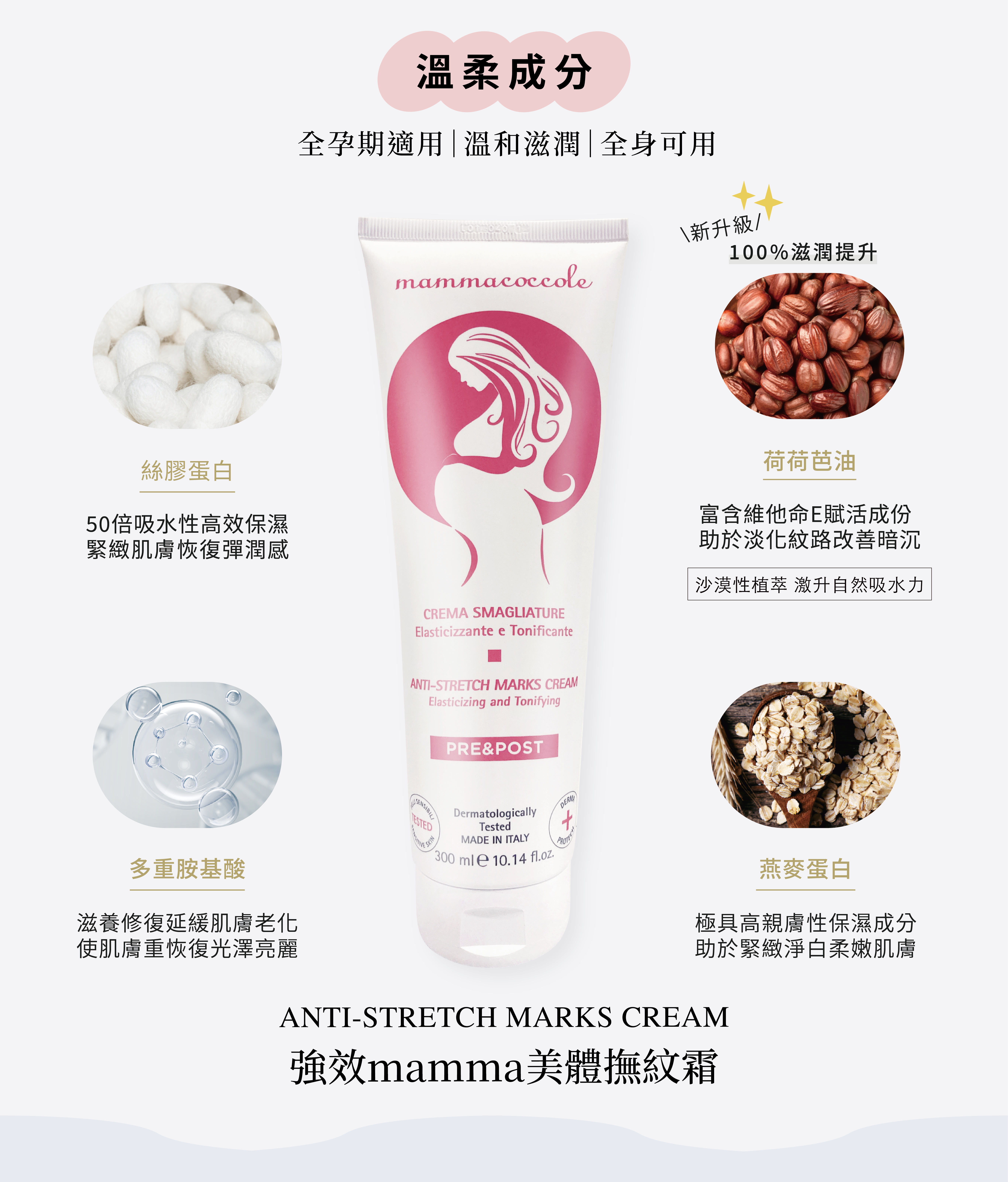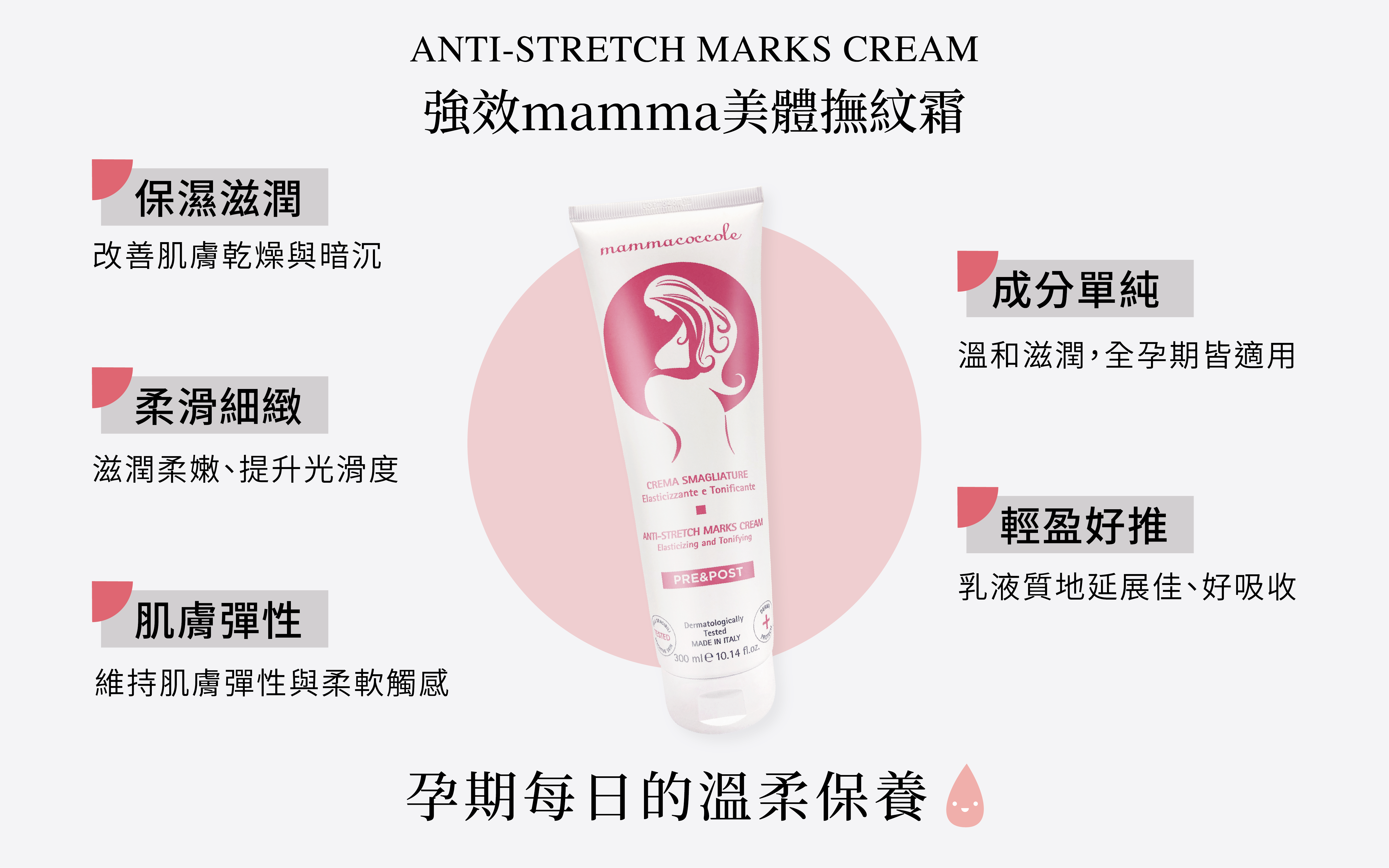 Babycoccole 強效mamma美體撫紋霜 300ml 會是很溫柔的選擇。