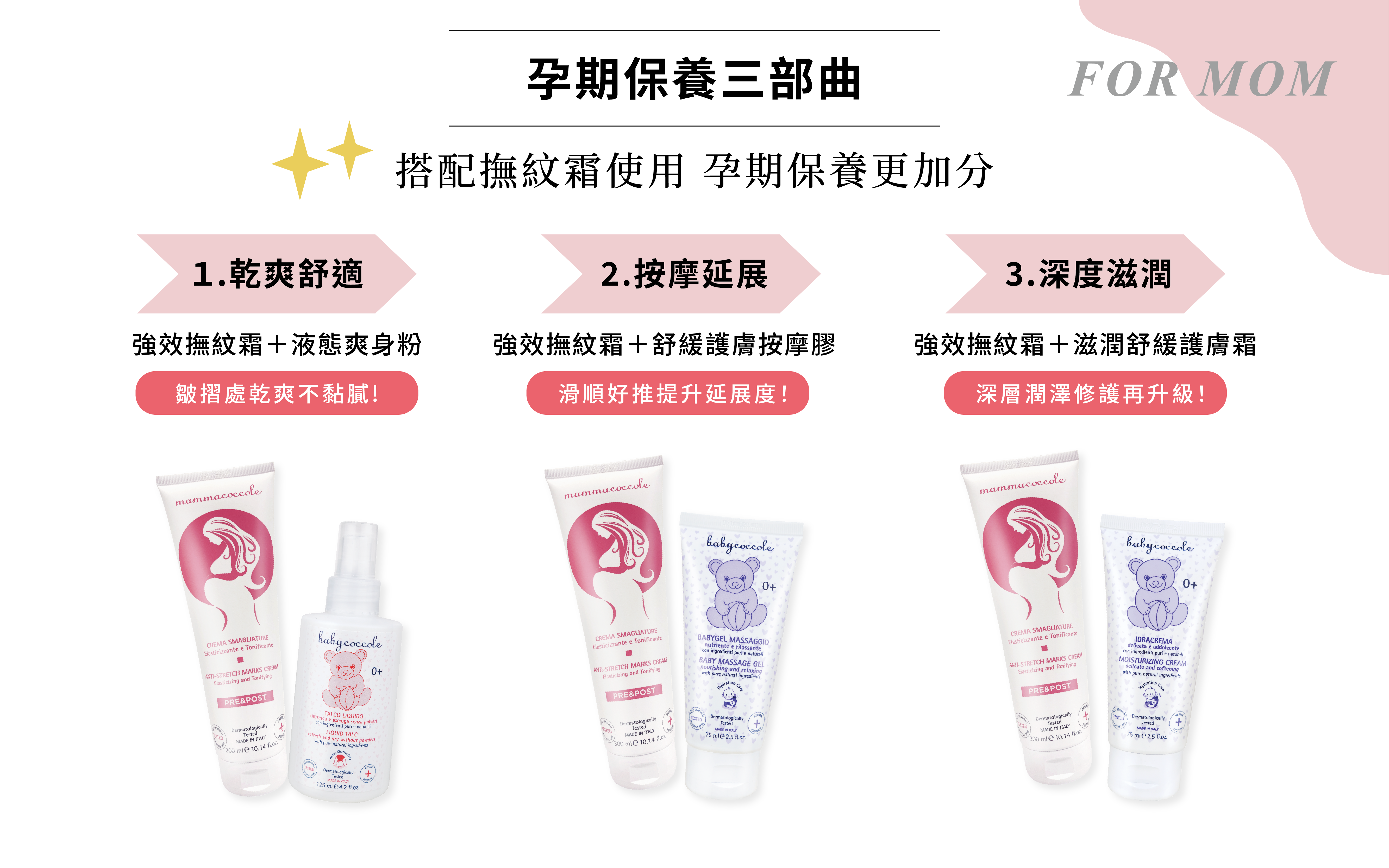 想讓孕期肌膚更舒服,可以搭配以下三款 Babycoccole 溫柔保養一起使用。