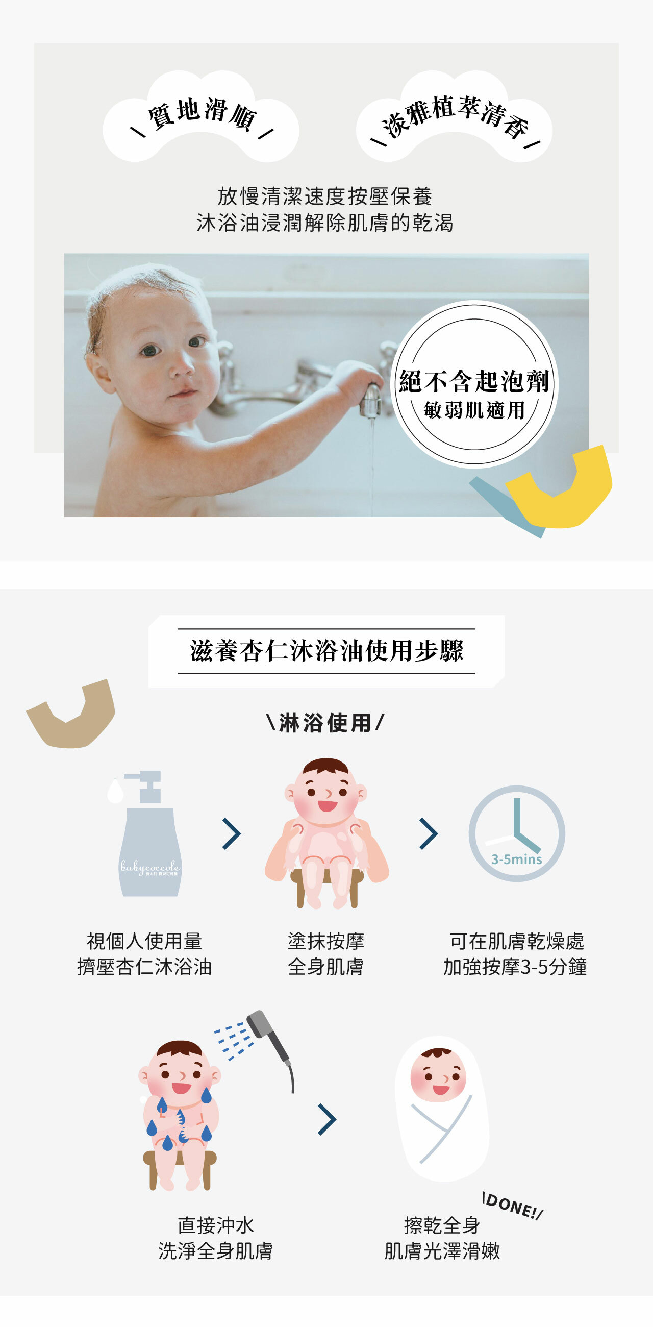 植萃杏仁油,使清潔同時提升肌膚的水潤感與柔嫩度,極致呵護寶貝細緻肌膚及乾燥肌,提升肌膚防護力,新生兒適用。