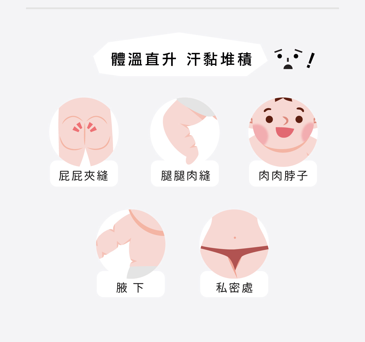 沐浴、換尿布後,取適量以指腹輕輕均勻塗抹開在屁屁夾縫、腿腿肉縫、肉肉脖子、腋下私密處,尤其是皮膚皺摺處,可保持肌膚乾爽。