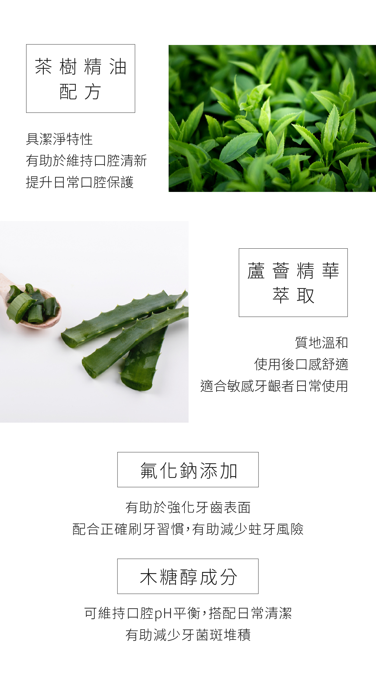 •茶樹精油配方:具潔淨特性,有助於維持口腔清新、提升日常口腔保護。