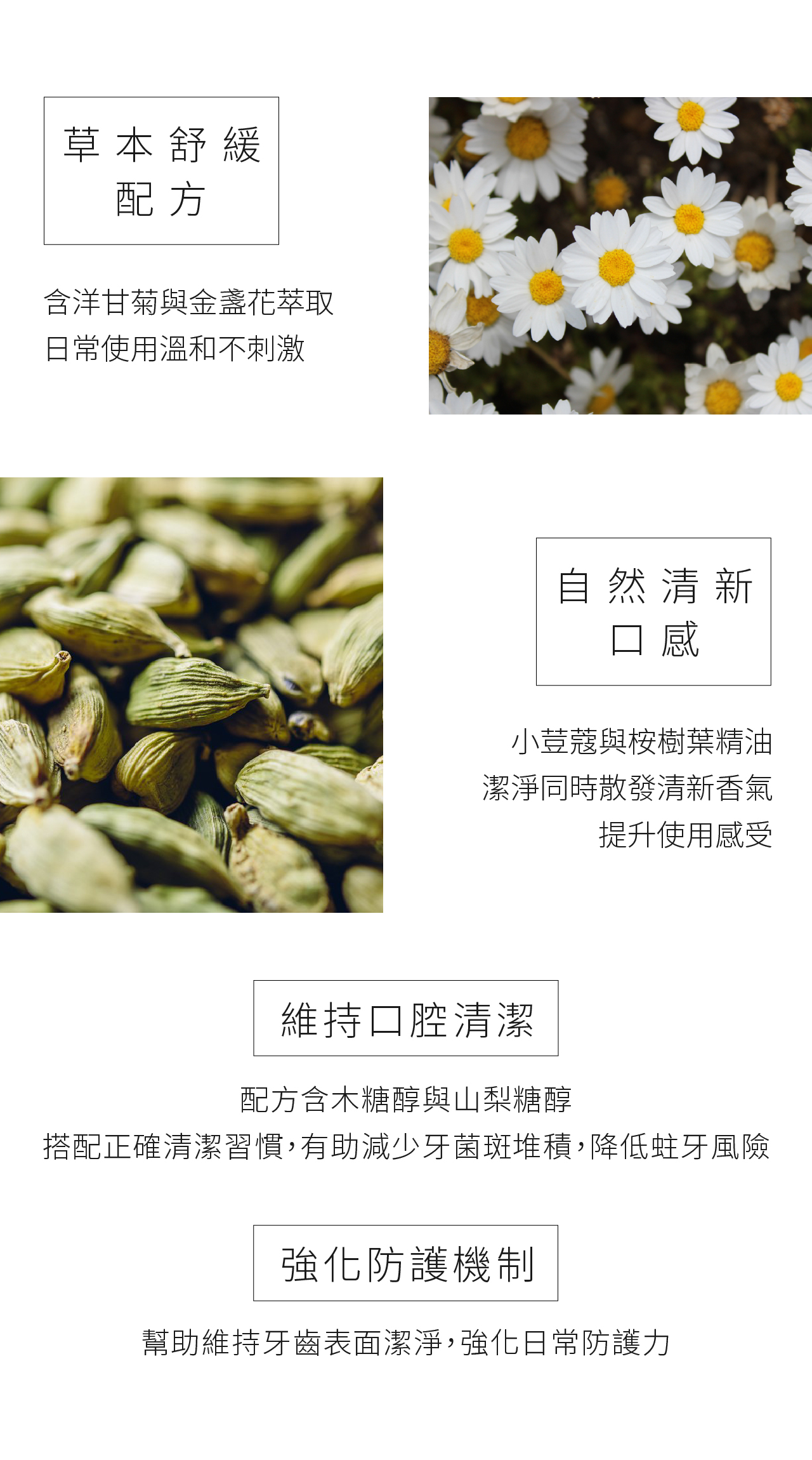 •草本舒緩配方:含洋甘菊與金盞花萃取,日常使用溫和不刺激,適合關注牙齦舒適者。